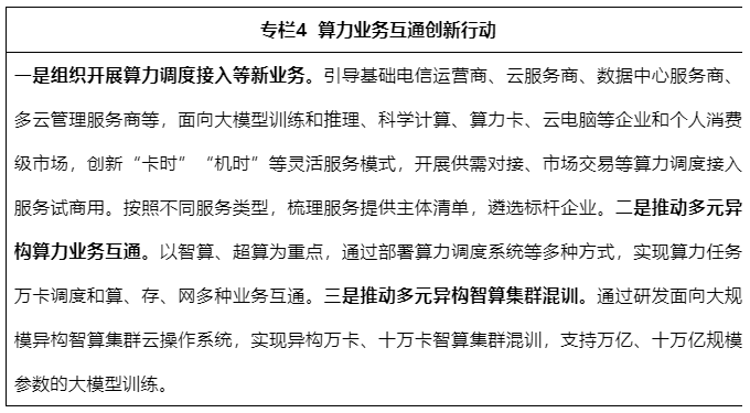 13. 探索构建算力互联网体系。以算力互联互通平台试点为基础,促进算力设施、资源、业务、应用互联互通,加速公共算力资源互联成网。探索在现有互联网体系架构内,面向公共算力实现架构增强和能力创新,推动形成一张智能感知、实时发现、随需获取的算力互联网,实现“一点接入、全算贯通”的算力服务。